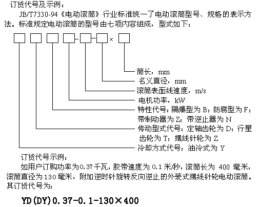 (2).用戶(hù)訂購(gòu)逆止電動(dòng)滾筒時(shí),須注明旋轉(zhuǎn)方向,如不注明則為任意方向。其表示方法為在特性代號(hào)后加“S”(表示在電機(jī)引出線一側(cè)觀察,端蓋應(yīng)順時(shí)針旋轉(zhuǎn))或“N”(表示在電機(jī)引出線一側(cè)觀察,端蓋應(yīng)逆時(shí)針旋轉(zhuǎn))。